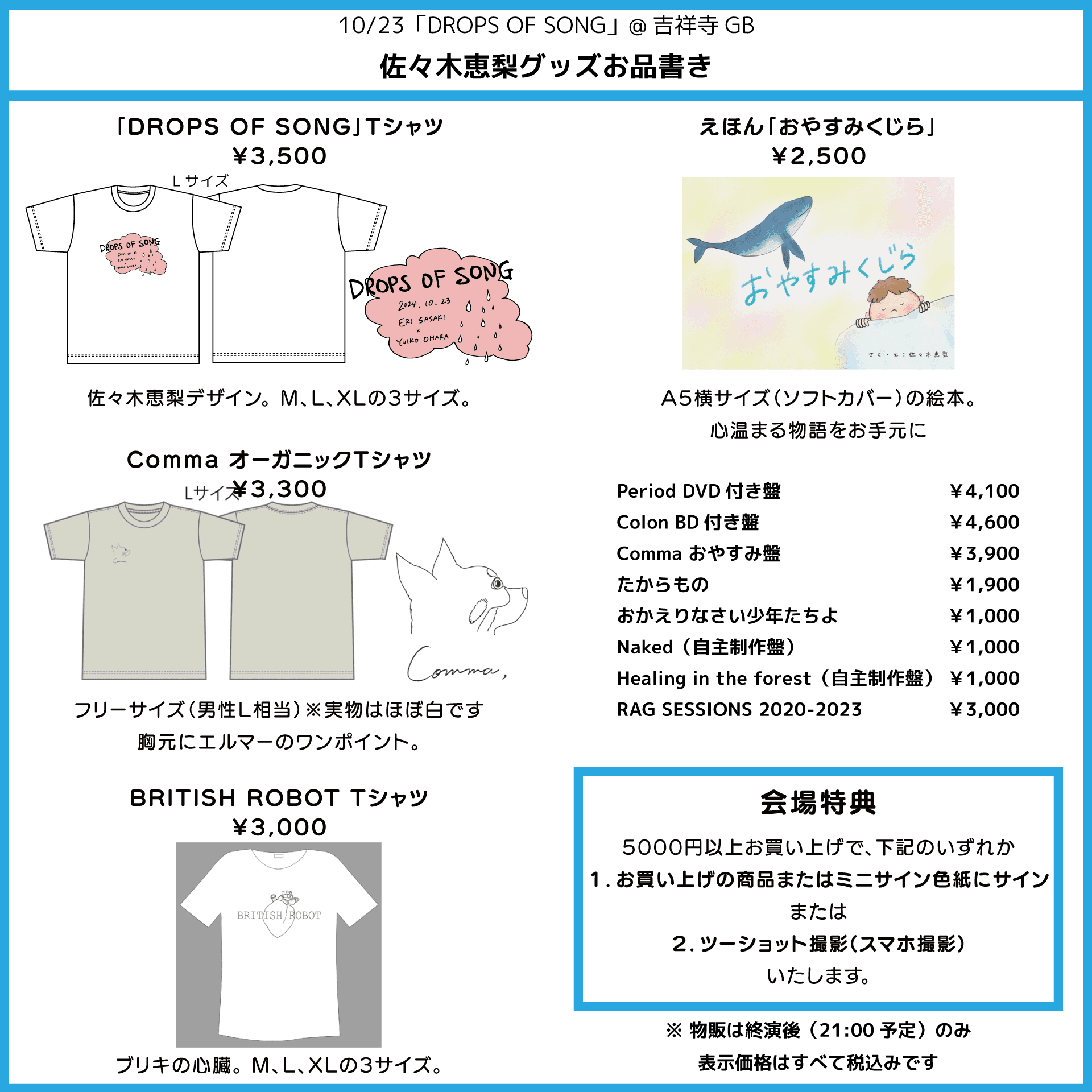 ※ 物販は終演後(21:00予定)のみとなります。